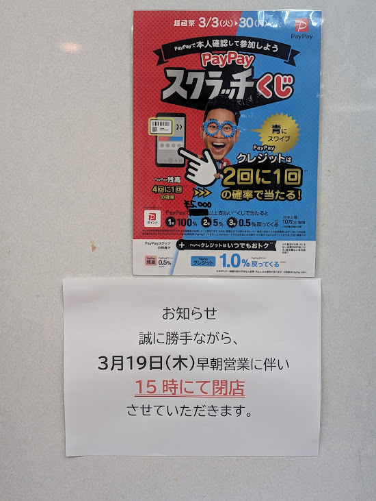 誠に勝手ながら、3月19日(木)は早朝営業に伴い、15時にて閉店させていただきます。