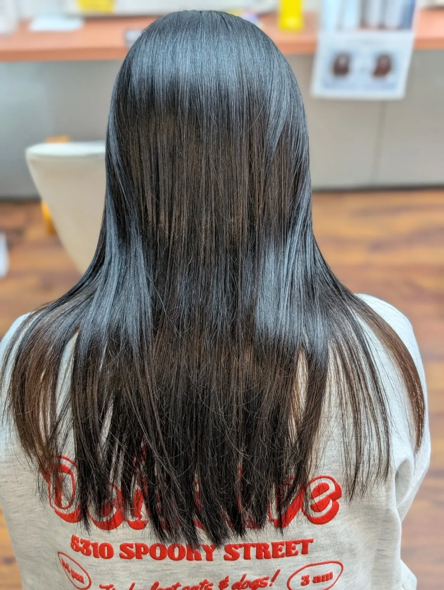 仕上がりは、写真の通りまるでシルクのようなツヤと、指通りの良いサラサラな質感。静電気なんて寄せ付けない、しっとりとまとまった美しいロングヘアに大変身されました。