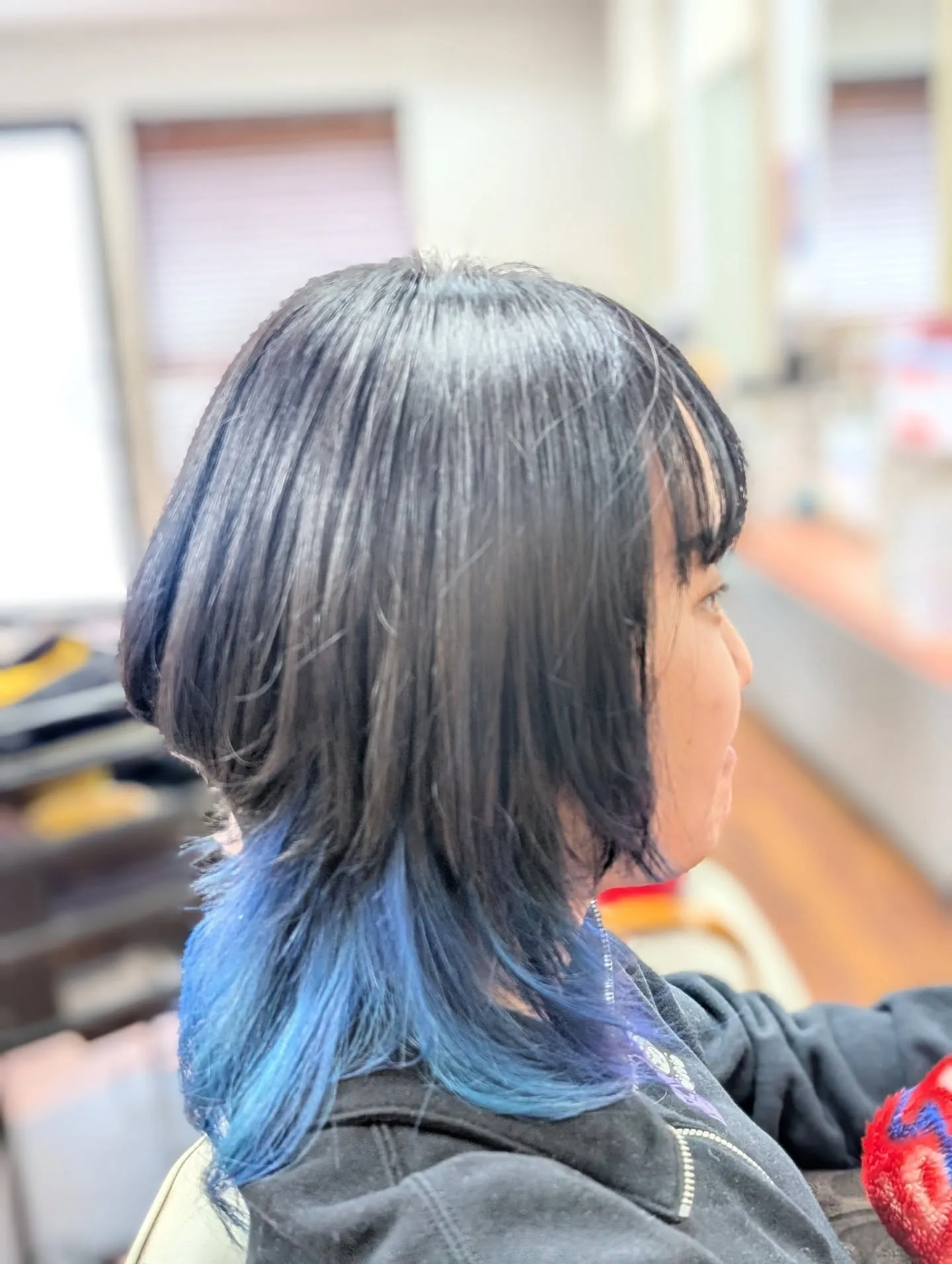 「ビビッドなブルー色が映える、ウルフレイヤーカット」です。
