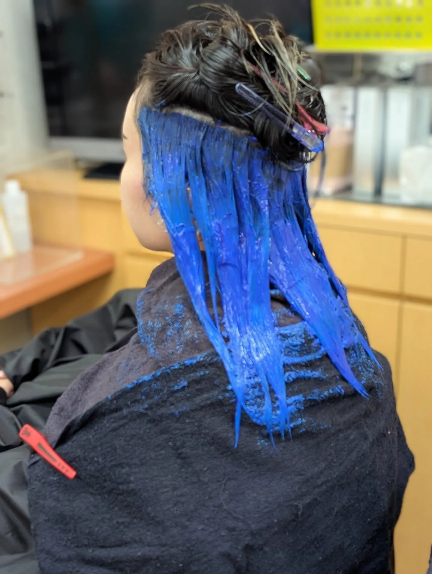 施術中の写真でもお分かりいただける通り、しっかりと計算してブリーチを行った上で、発色の良いブルーをたっぷりと乗せました。