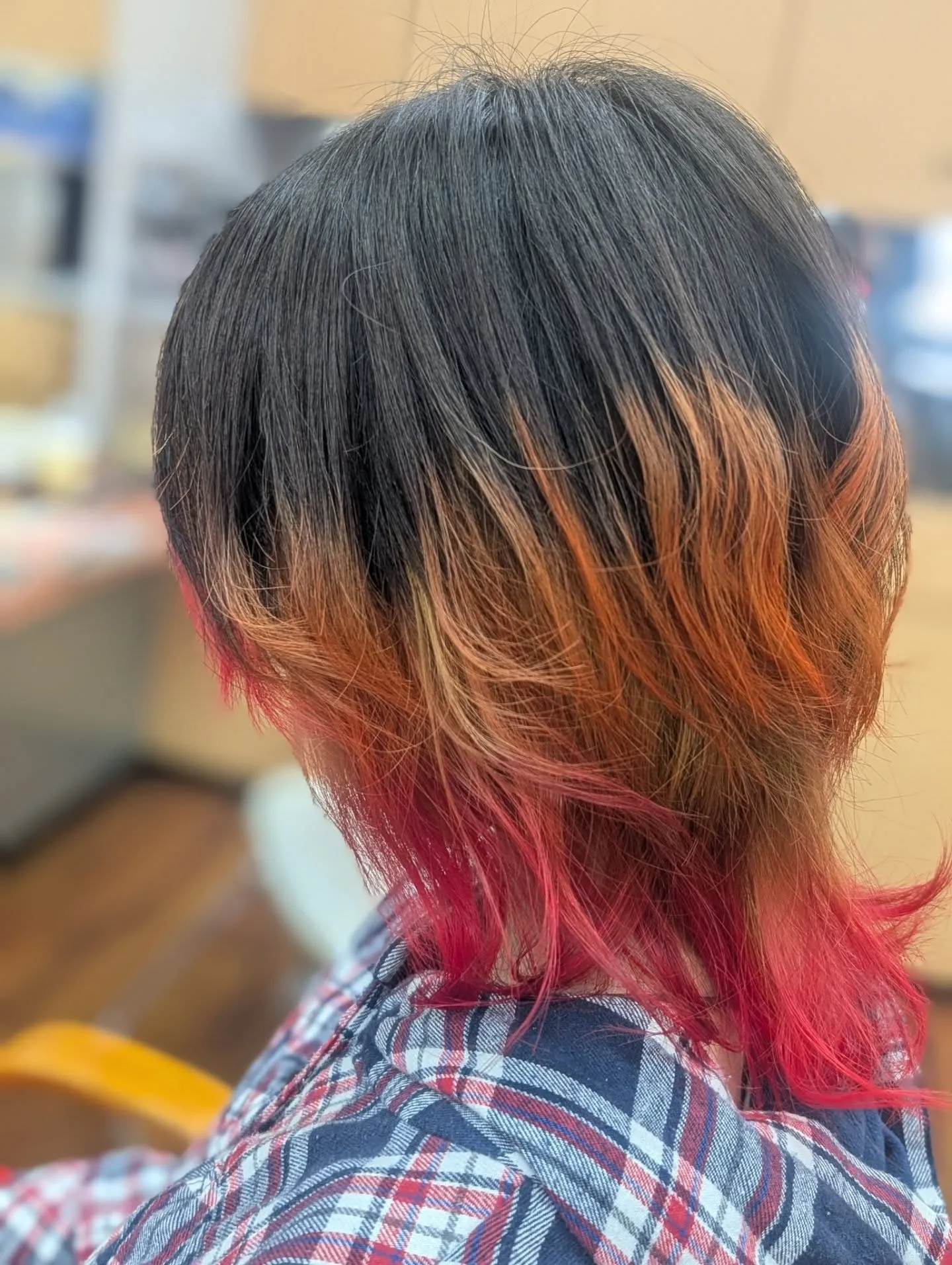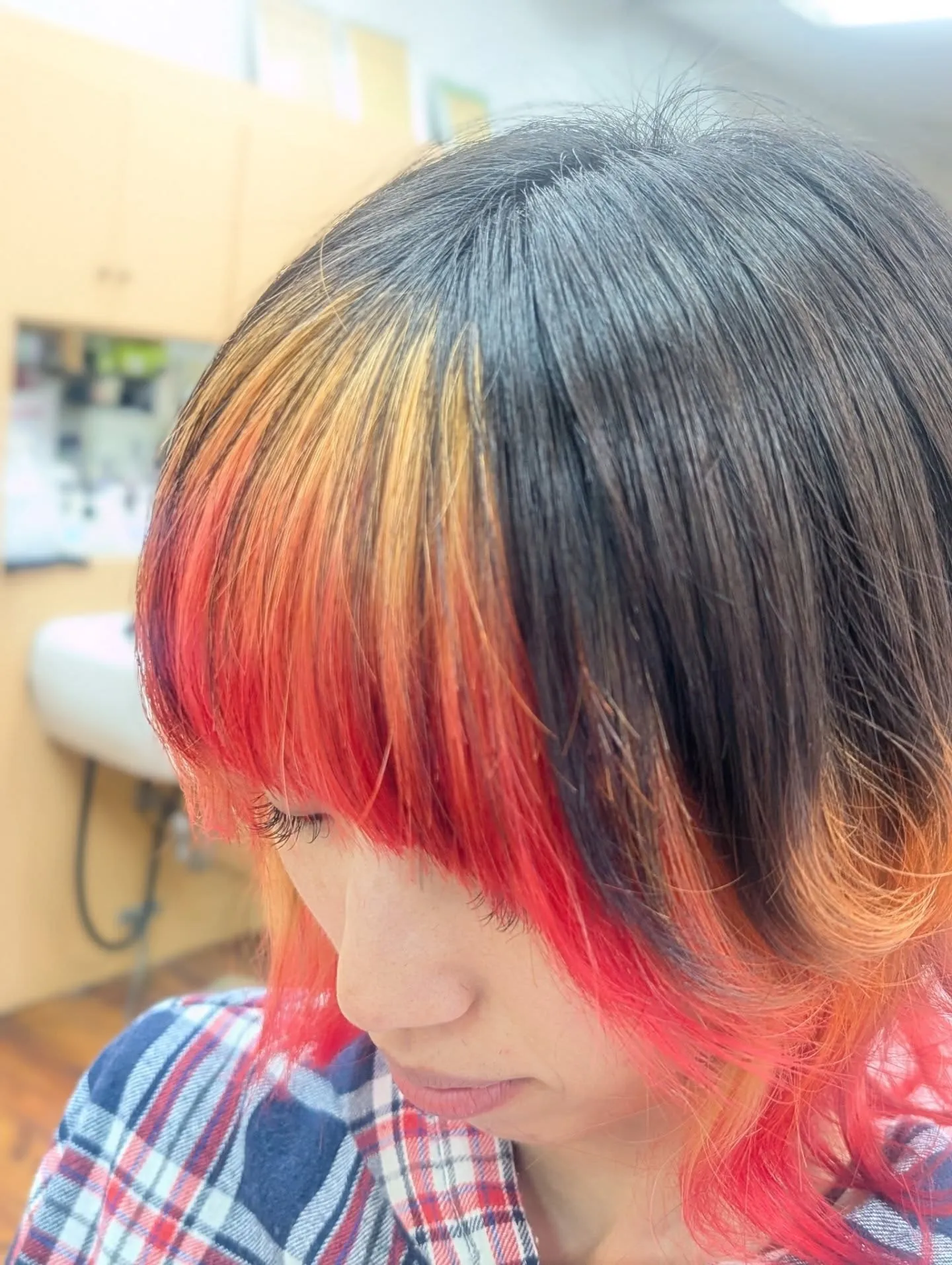 トップの毛先には竈門禰豆子をイメージした愛らしいカラーをプラス。さらに前髪部分には、今トレンドの「アンブレラカラー」を取り入れ、表面の炎の色と内側のデザインが動くたびに表情を変える、